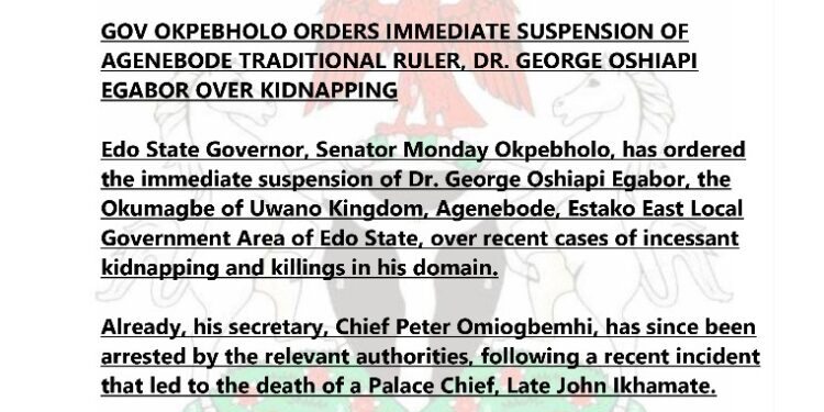 Edo State Governor, Senator Monday Okpebholo, has ordered the immediate suspension of Dr. George Oshiapi Egabor, the Okumagbe of Uwano Kingdom, Agenebode, Estako East Local Government Area of Edo State, over recent cases of incessant kidnapping and killings in his domain.
