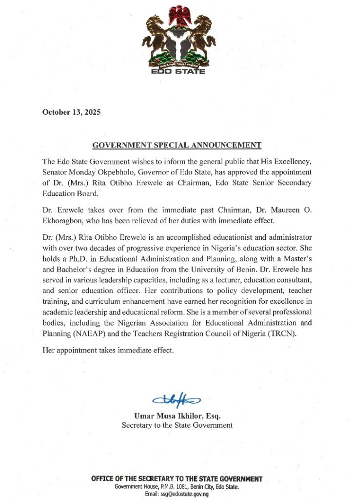 The Edo State Government wishes to inform the general public that His Excellency, Senator Monday Okpebholo, Governor of Edo State, has approved the appointment of Dr. (Mrs.) Rita Otibho Erewele as Chairman, Edo State Senior Secondary Education Board.