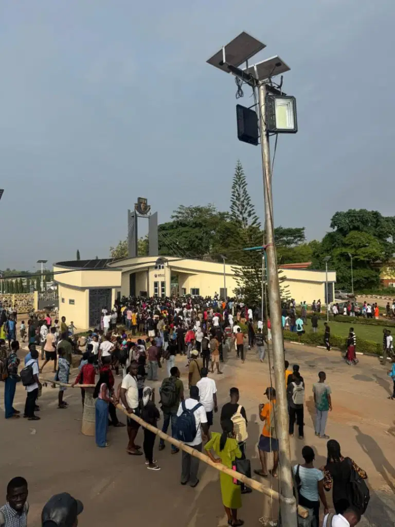 Students of Obafemi Awolowo University (OAU), Ile-Ife, have barricaded the Ife-Ede road in protest against the inadequate transportation system on campus. The protest began early Tuesday morning, with students singing solidarity songs and diverting traffic.
